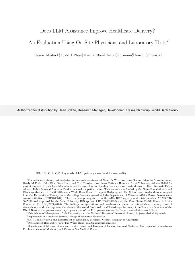 世界银行:LLM援助是否改善了医疗服务?使用现场医生和实验室测试进行评估(英文版).pdf