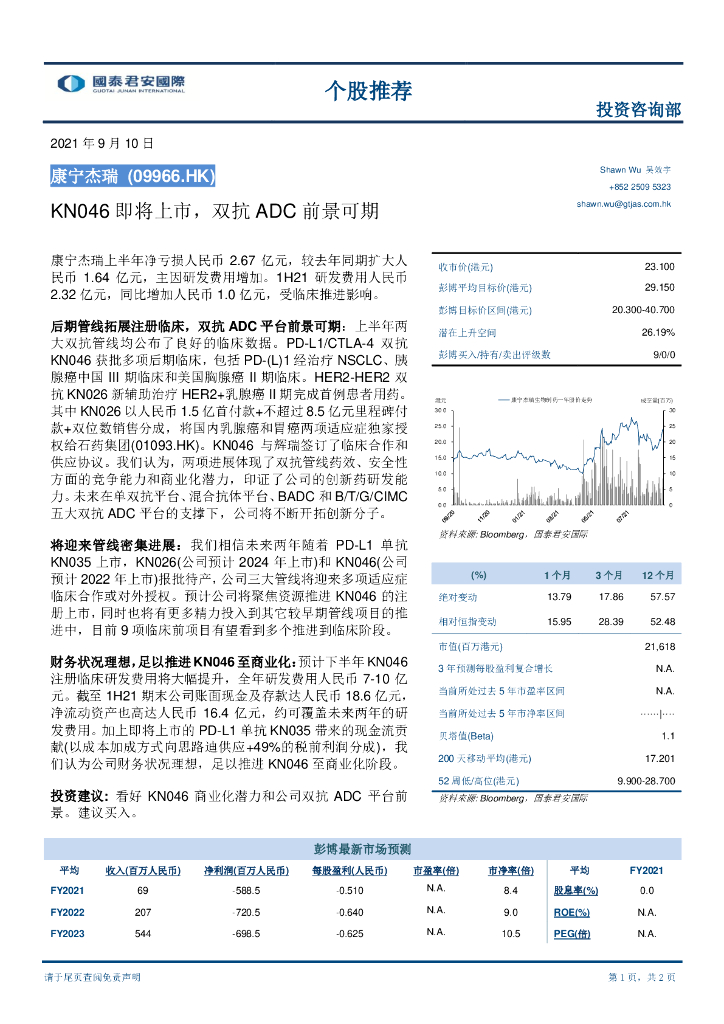 国泰君安证券(香港):康宁杰瑞制药-B(09966)港股公司研究报告-KN046即将上市,双抗ADC前景可期.pdf