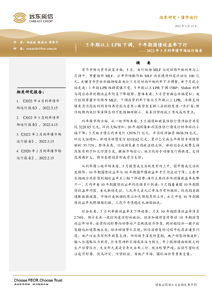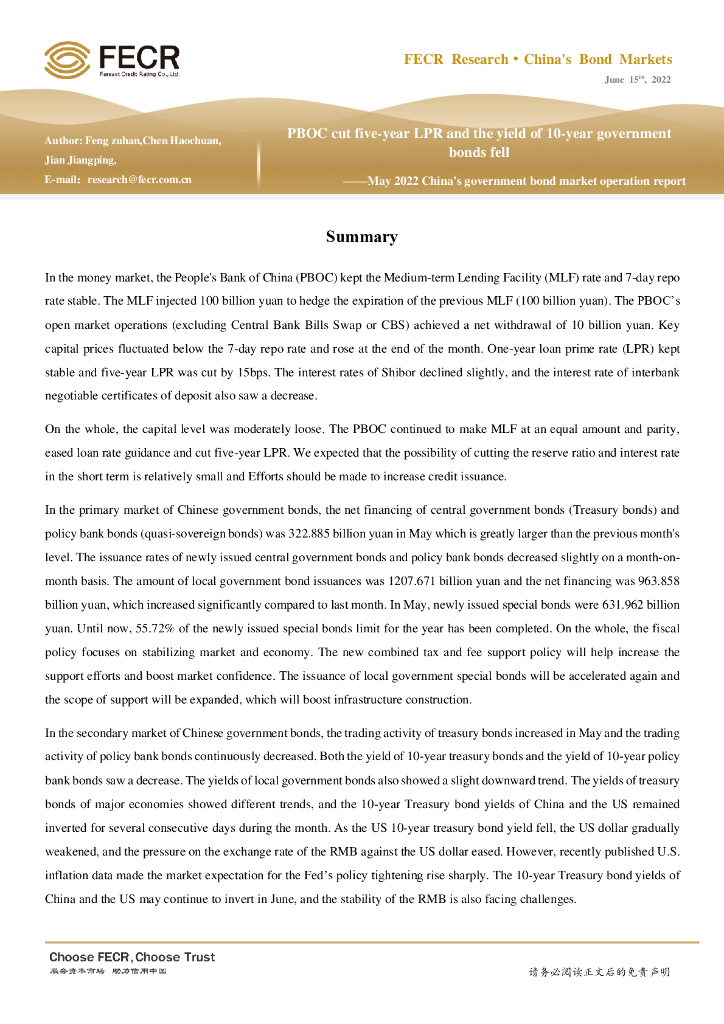 远东资信:5年期以上LPR下调,十年期国债收益率下行——2022年5月利率债市场运行报告.pdf