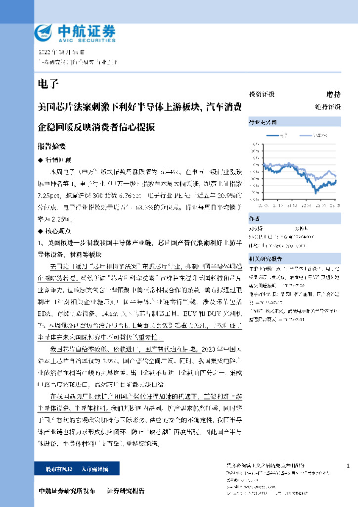 中航证券:电子:美国芯片法案刺激下利好半导体上游板块,汽车消费企稳回暖反映消费者信心提振.pdf