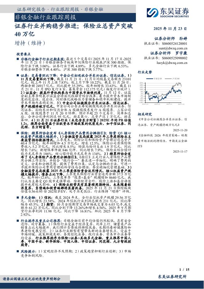 东吴证券:非银金融行业跟踪周报:证券行业并购稳步推进;保险业总资产突破40万亿.pdf