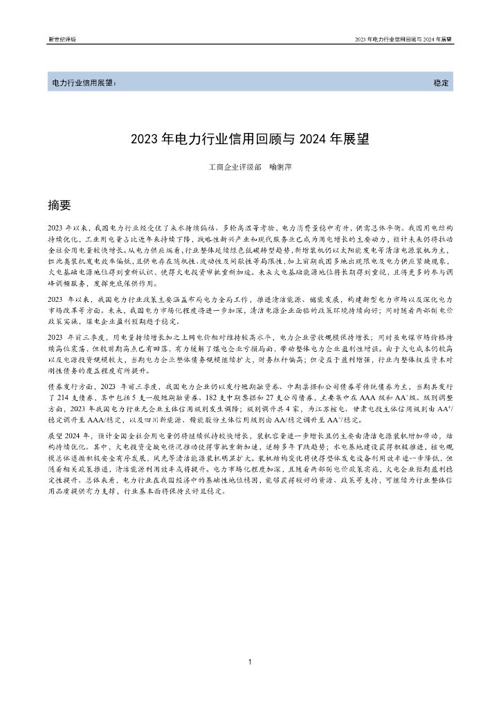 新世纪评级:2023年电力行业信用回顾与2024年展望报告.pdf