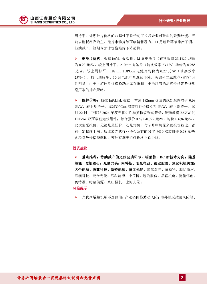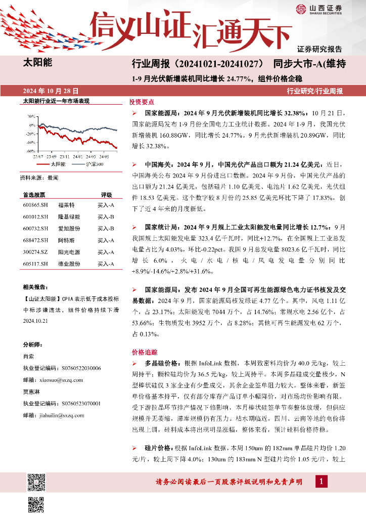 山西证券:太阳能行业周报:1-9月光伏新增装机同比增长24.77%,组件价格企稳.pdf
