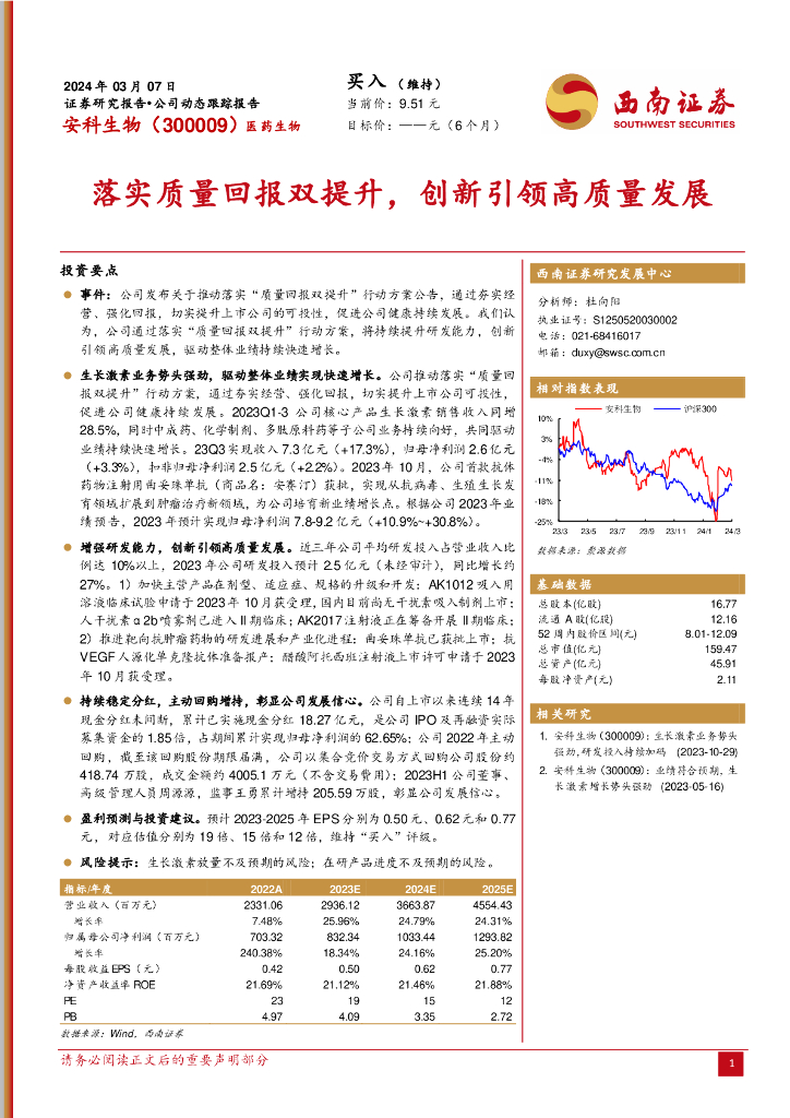 西南证券:安科生物(300009)-落实质量回报双提升,创新引领高质量发展.pdf
