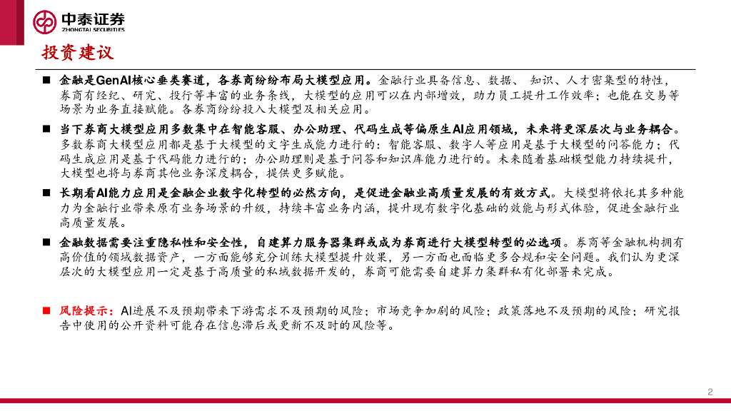 中泰证券:AI+系列之一:券商大模型应用进展几何?.pdf
