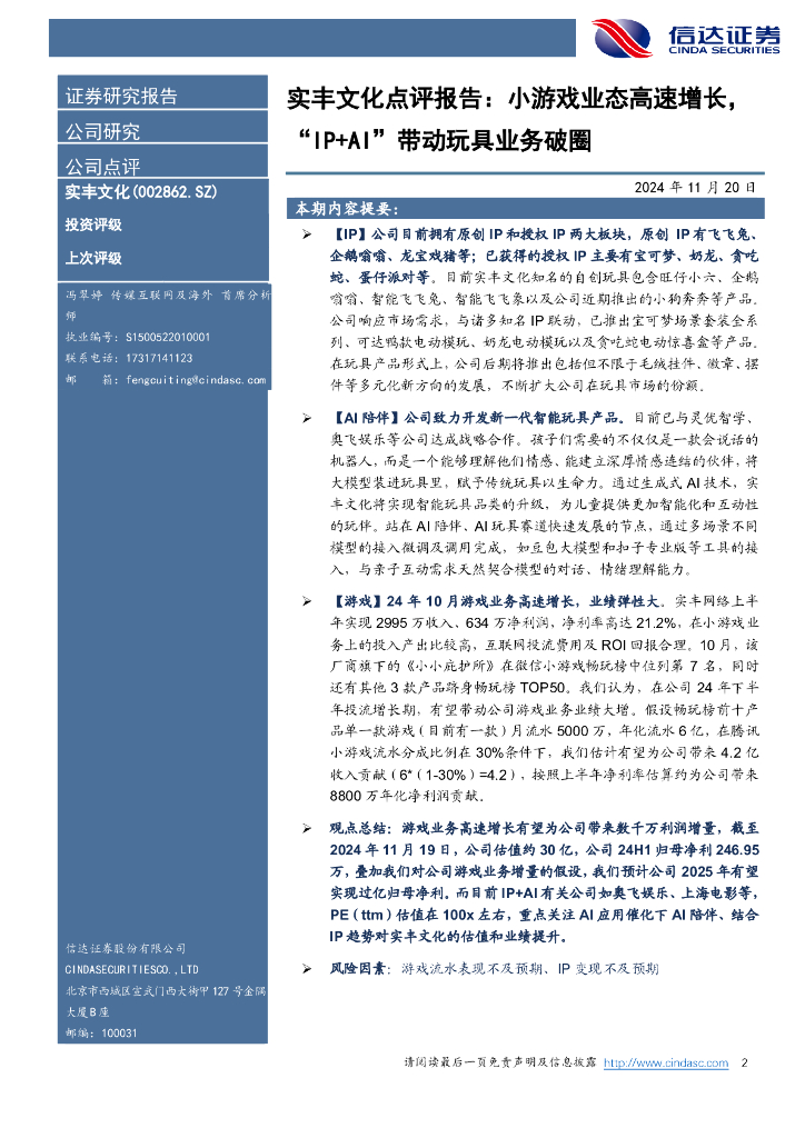 信达证券:实丰文化点评报告:小游戏业态高速增长,“IP+AI”带动玩具业务破圈.pdf