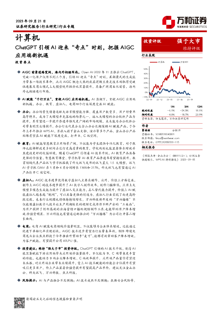 万和证券:计算机行业专题:ChatGPT引领AI迎来“奇点”时刻,把握AIGC应用端新机遇.pdf
