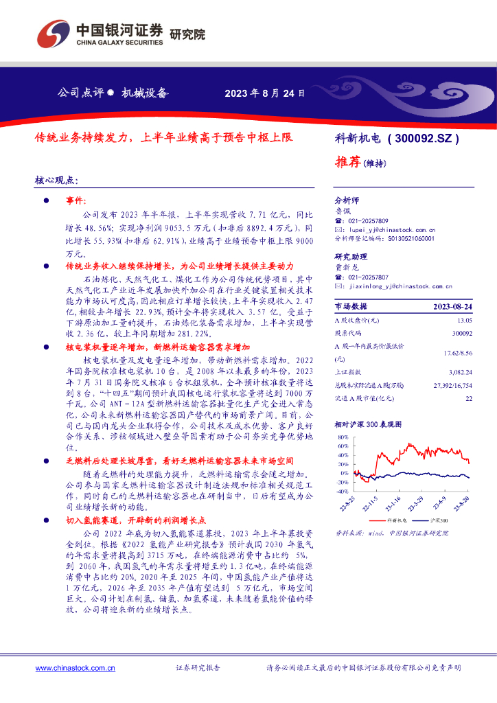 中国银河:科新机电(300092)-传统业务持续发力,上半年业绩高于预告中枢上限.pdf
