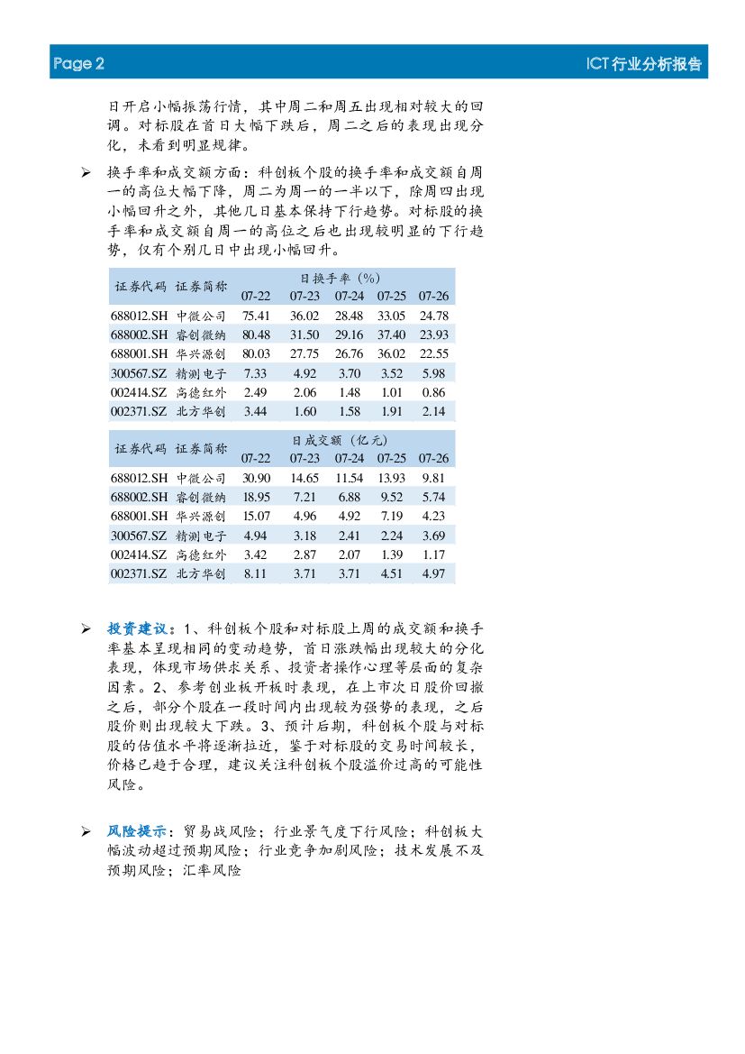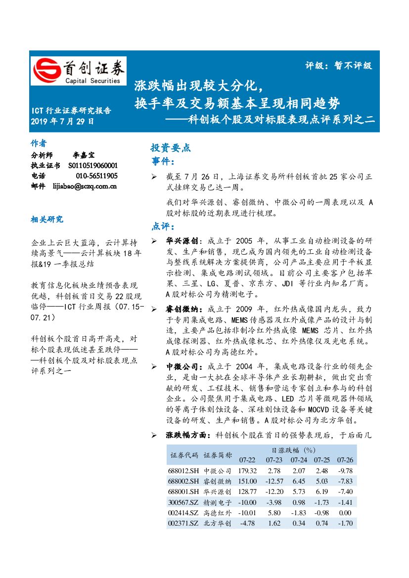 首创证券:ICT行业科创板个股及对标股表现点评系列之二:涨跌幅出现较大分化,换手率及交易额基本呈现相同趋势.pdf
