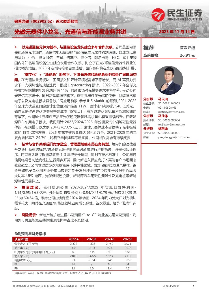 民生证券:铭普光磁(002902)-首次覆盖报告:光磁元器件小龙头,光通信与新能源业务并进.pdf