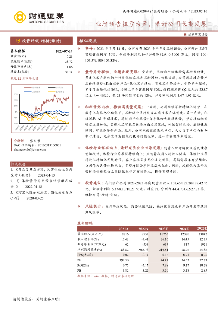 财通证券:美年健康(002044)-业绩预告扭亏为盈,看好公司长期发展.pdf