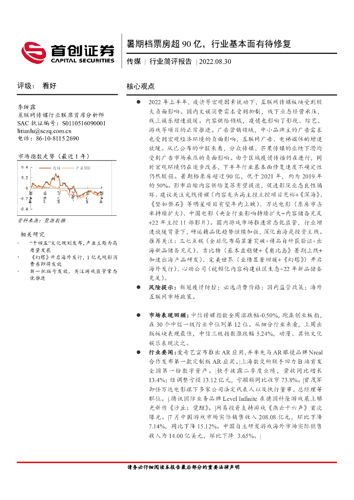 首创证券:传媒行业简评报告:暑期档票房超90亿,行业基本面有待修复.pdf