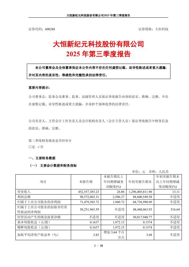 600288-大恒科技:大恒新纪元科技股份有限公司2025年第三季度报告.pdf