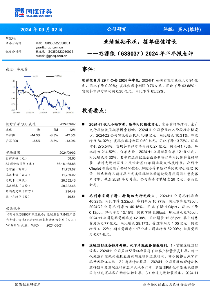 国海证券:芯源微(688037)-2024年半年报点评:业绩短期承压,签单稳健增长.pdf
