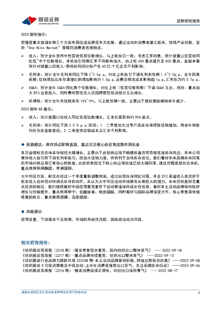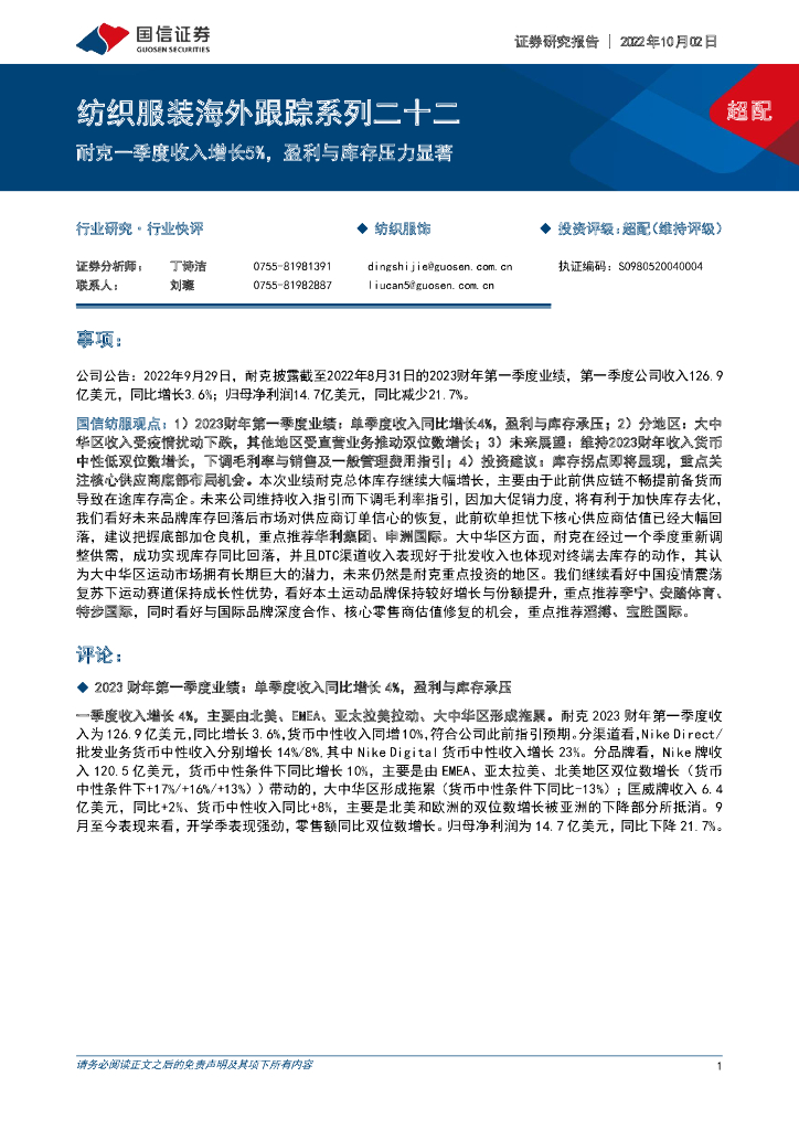 国信证券:纺织服装海外跟踪系列二十二:耐克一季度收入增长5%,盈利与库存压力显著.pdf
