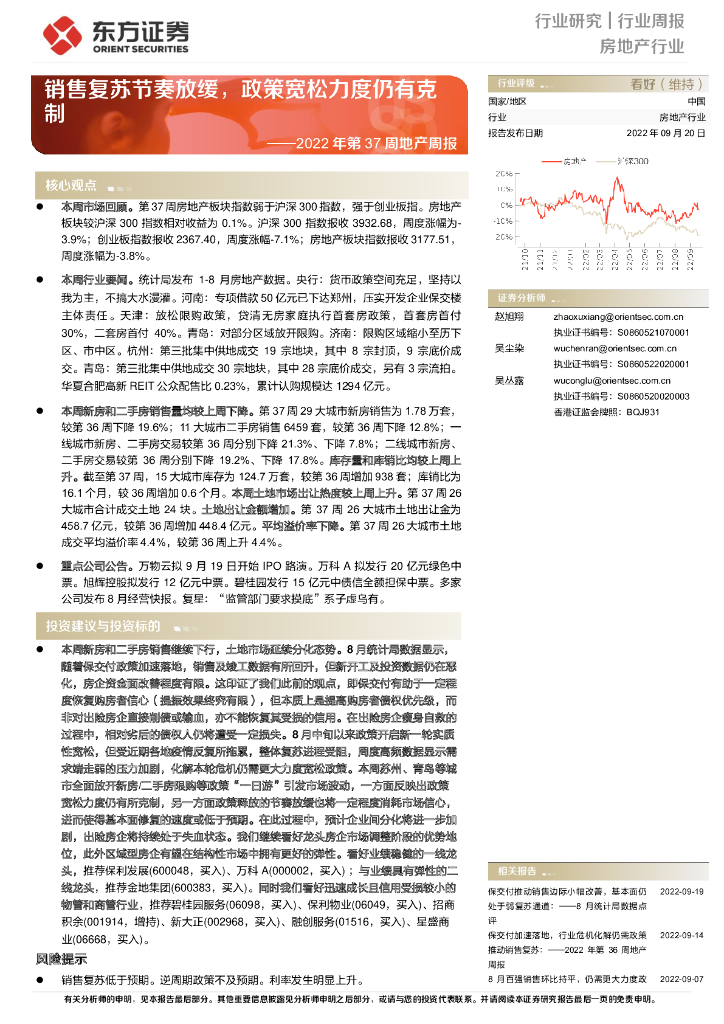 东方证券:2022年第37周地产周报:销售复苏节奏放缓,政策宽松力度仍有克制.pdf