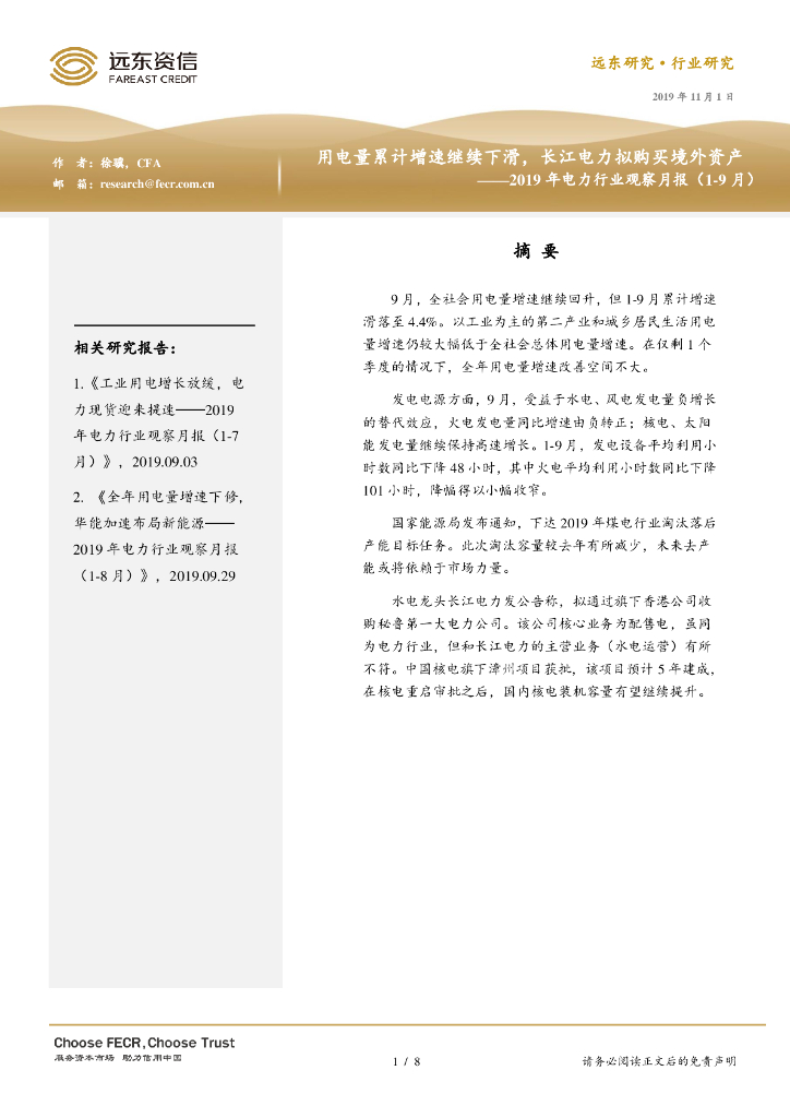 远东资信:用电量累计增速继续下滑,长江电力拟购买境外资产——2019年电力行业观察月报(1-9月).pdf
