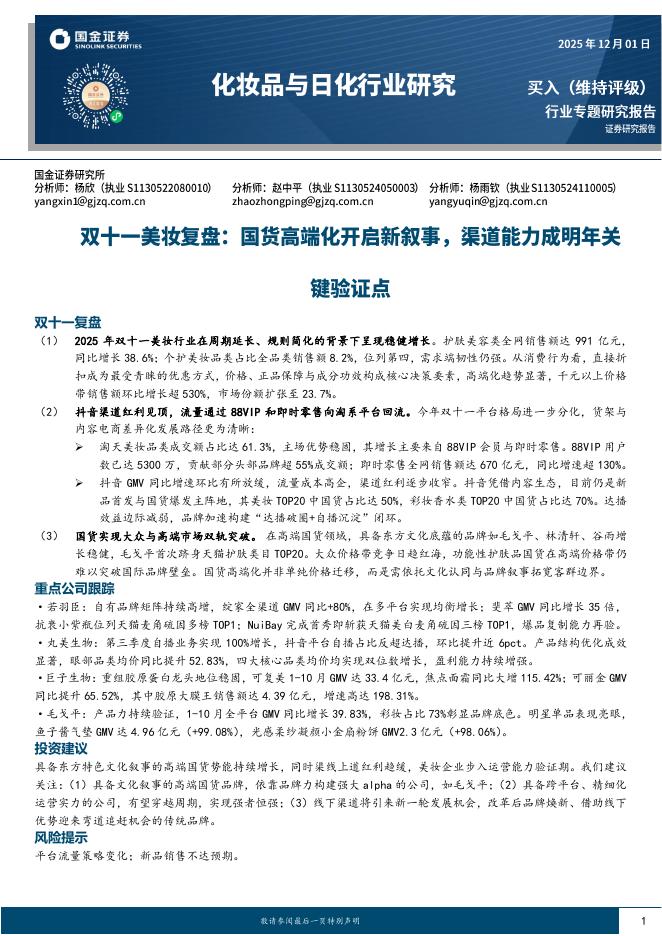 国金证券:化妆品与日化行业研究:双十一美妆复盘:国货高端化开启新叙事,渠道能力成明年关键验证点.pdf