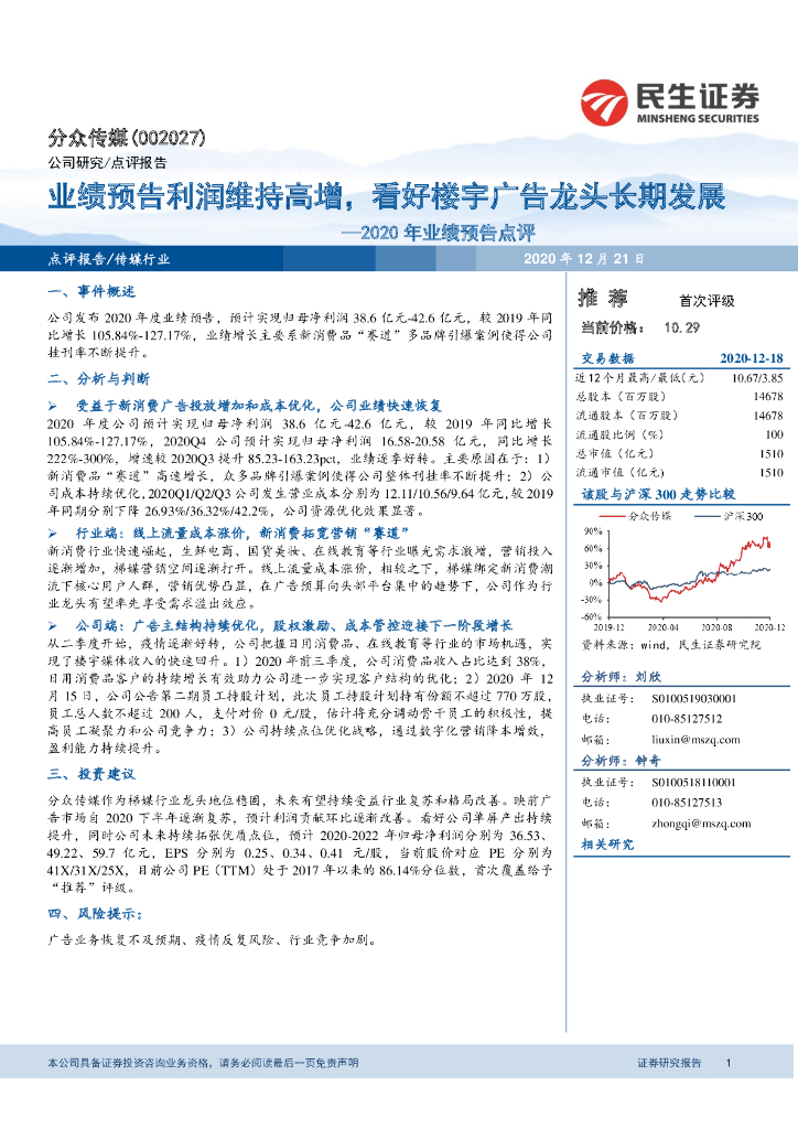 民生证券:分众传媒(002027)-2020年业绩预告点评:业绩预告利润维持高增,看好楼宇广告龙头长期发展.pdf