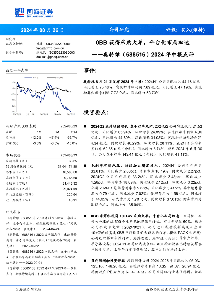 国海证券:奥特维(688516)-2024年中报点评:0BB获得采购大单,平台化布局加速.pdf