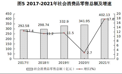 全年全市社会消费品零售总额402.13亿元,比上年增长17.6%。按城乡分,城镇消费品零售额352.21亿元,增长17.5%;乡村消费品零售额49.92亿元,增长18.6%。按消费类型分,餐饮收入34.68亿元,增长34.6%;商品零售367.45亿元,增长16.2%。