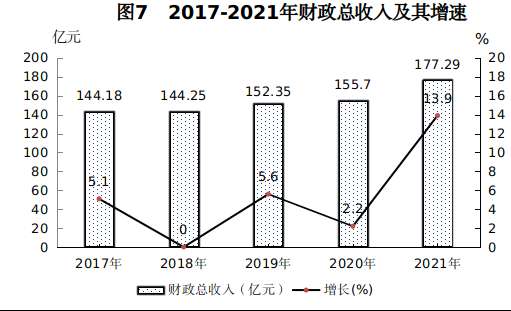 全年财政总收入177.29亿元,比上年增长13.9%。其中,一般公共预算收入81.58亿元,增长1.5%。税收总收入159.08亿元,增长14.3%,占财政总收入的比重为89.7%,比上年提高0.3个百分点。其中,增值税101.53亿元,增长29.7%。全年一般公共预算支出157.72亿元,下降3.7%。其中,一般公共服务支出14.39亿元,增长8.0%;资源勘探信息等事务支出28.67亿元,增长30.1%;住房保障支出9.12亿元,增长24.4%。