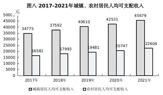 全年全市城镇居民人均可支配收入45679元,比上年增长7.4%;农村居民人均可支配收入22604元,增长9.0%。城镇居民人均消费支出27516元,增长12.0%;农村居民人均消费支出17741元,增长14.1%。