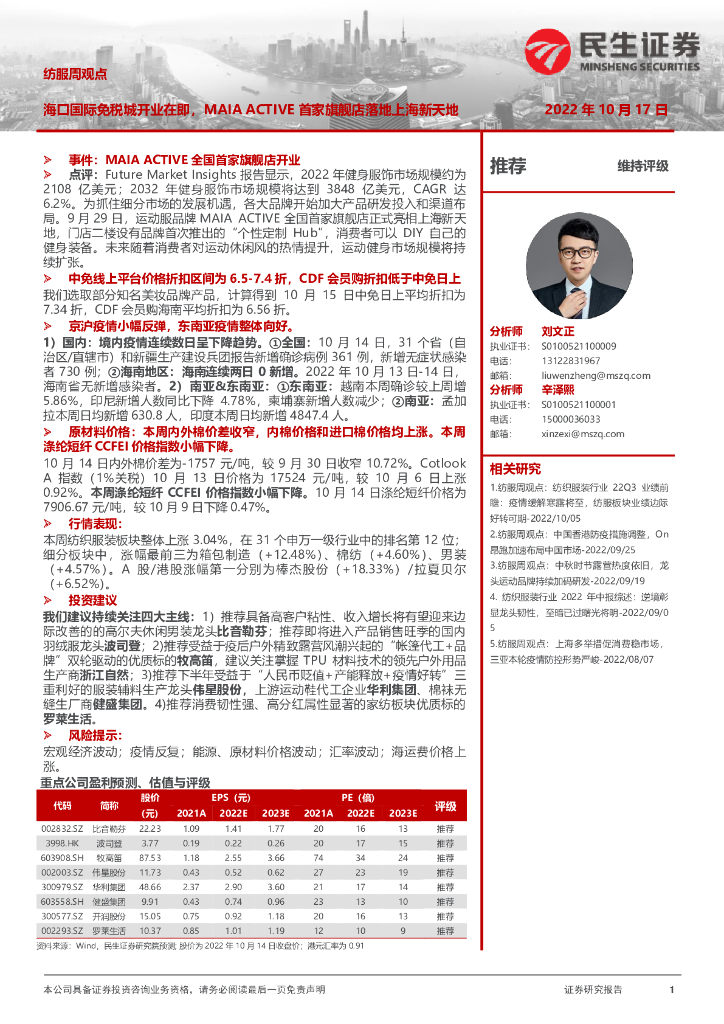 民生证券:纺服周观点:海口国际免税城开业在即,MAIA ACTIVE首家旗舰店落地上海新天地.pdf