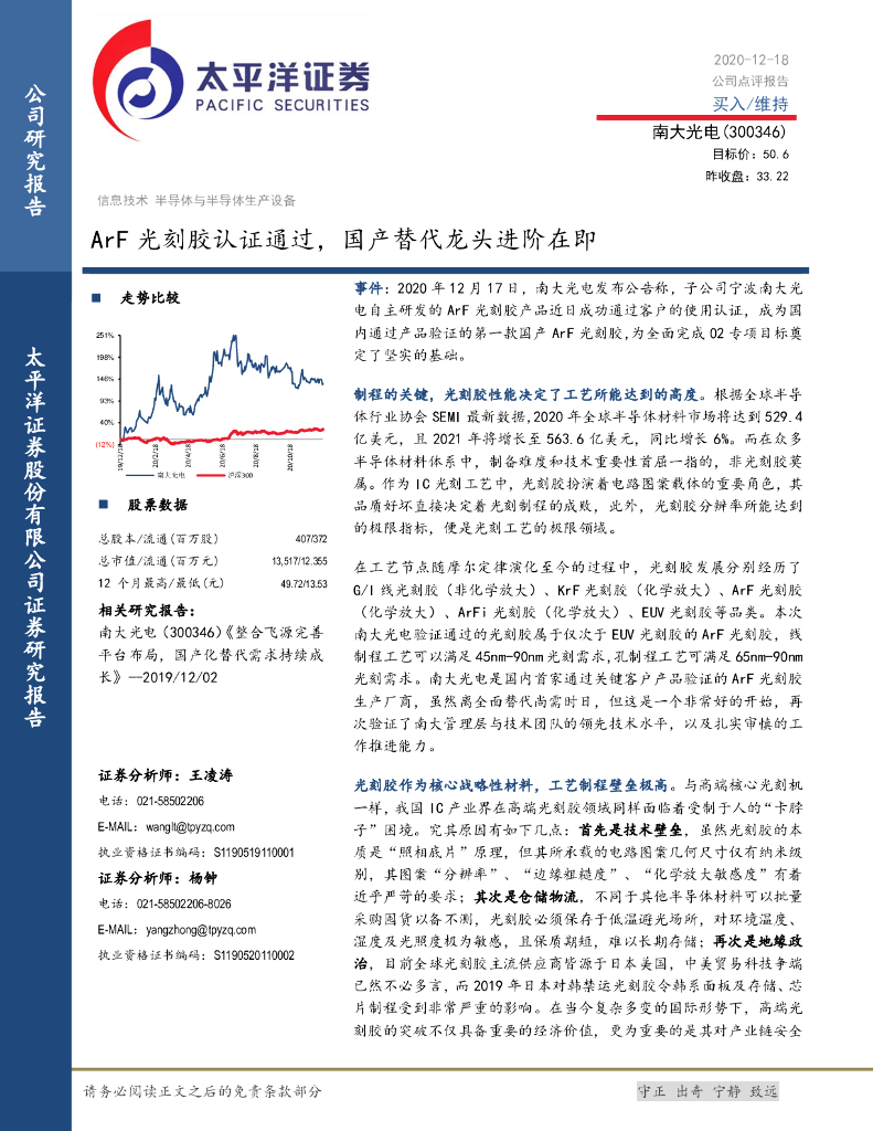 太平洋证券:南大光电(300346)-ArF光刻胶认证通过,国产替代龙头进阶在即.pdf
