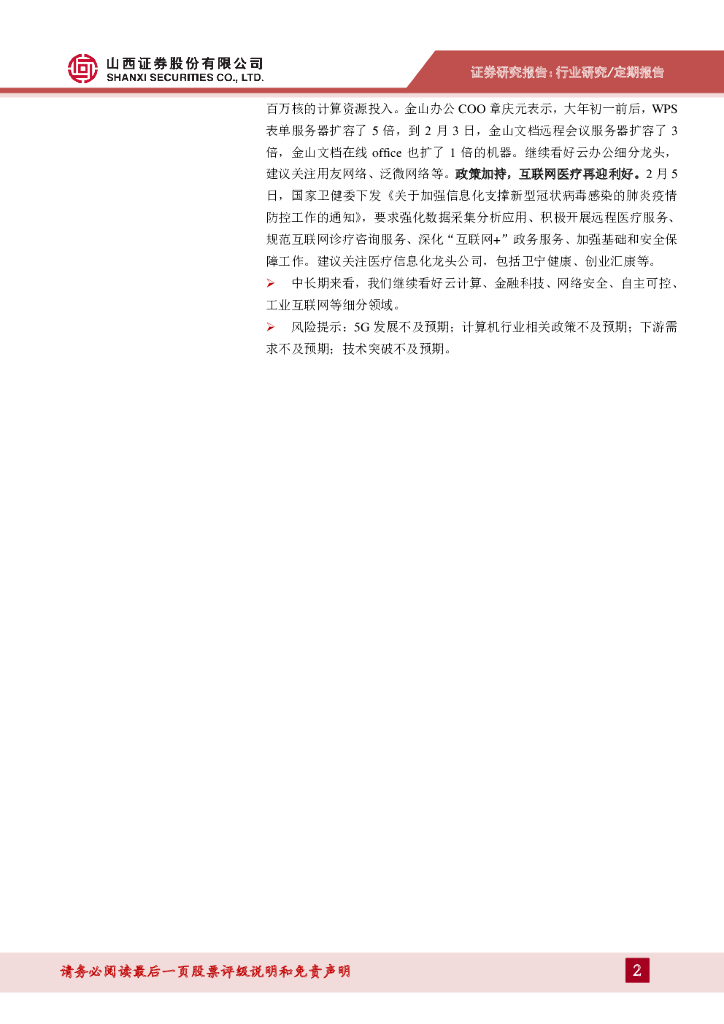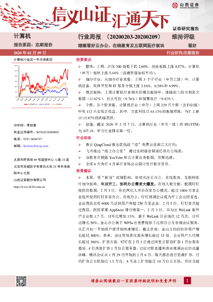 山西证券:计算机行业周报:继续看好云办公、在线教育及互联网医疗板块.pdf