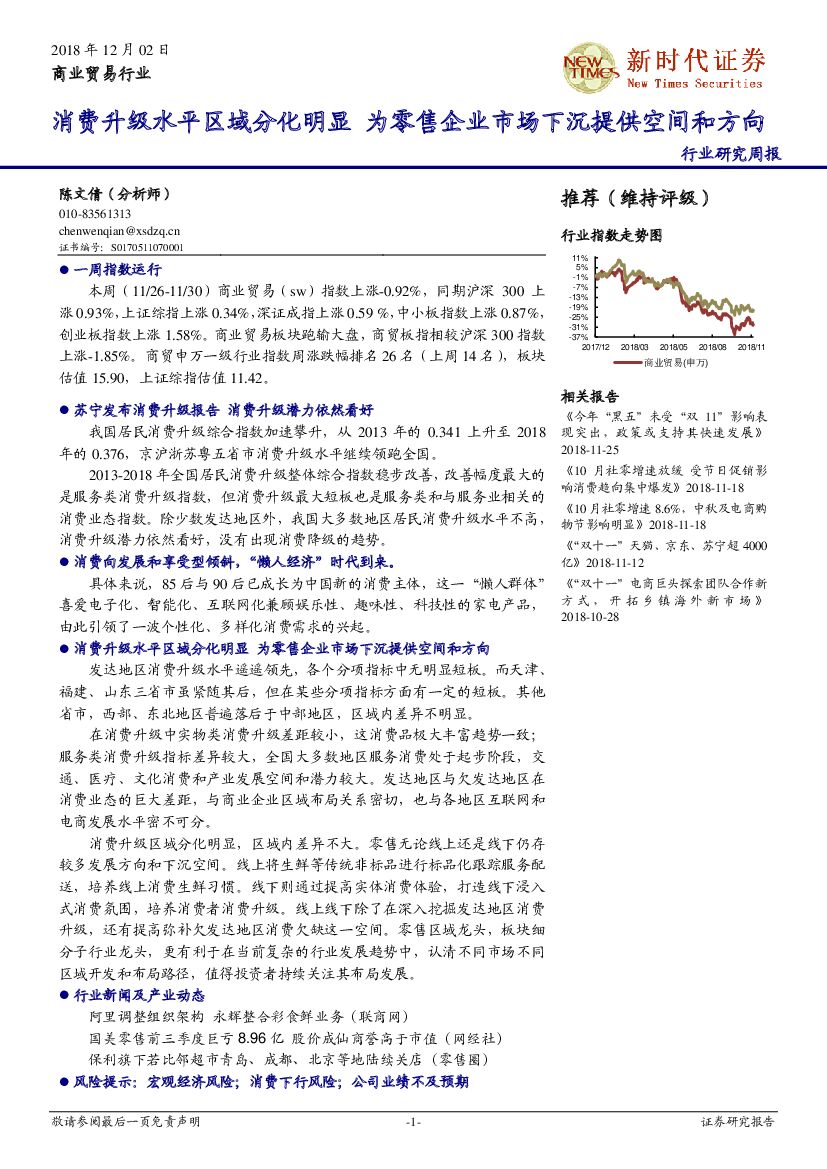 新时代证券:商业贸易行业研究周报:消费升级水平区域分化明显 为零售企业市场下沉提供空间和方向.pdf