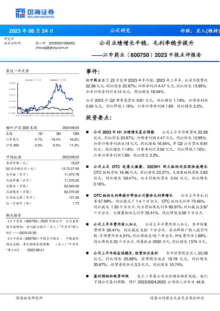 国海证券:江中药业(600750)-2023中报点评报告:公司业绩增长平稳,毛利率稳步提升.pdf