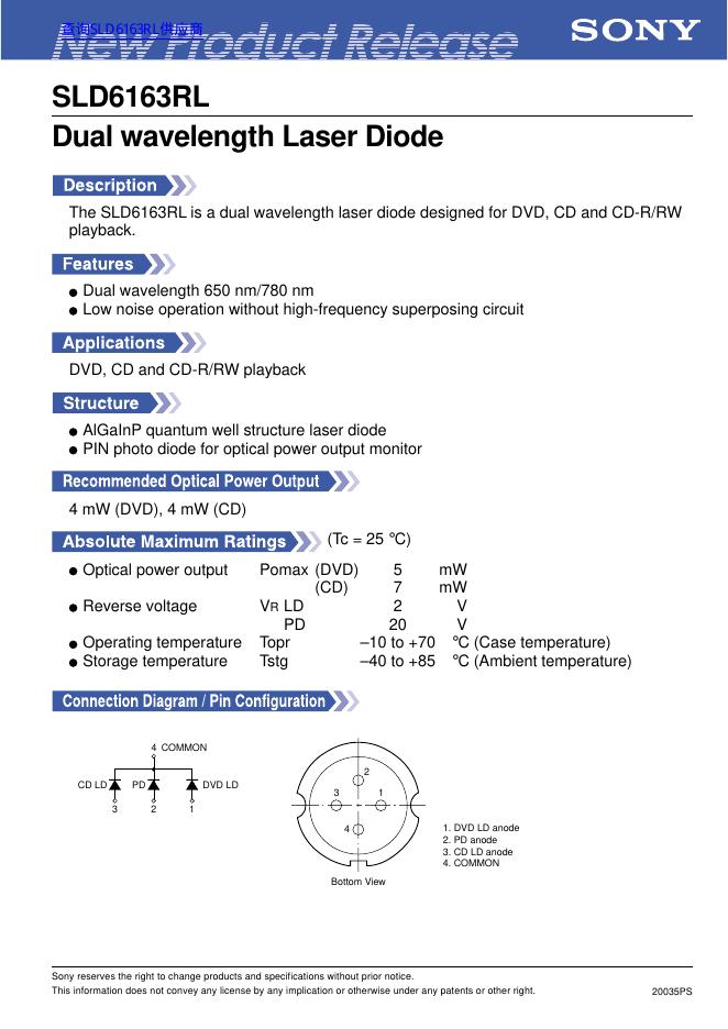 SONY SLD6163RL Dual wavelength Laser Diode 数据手册.pdf