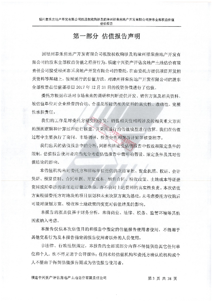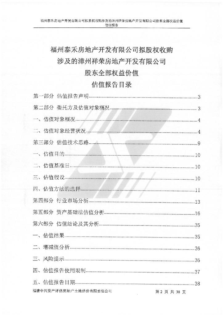 2018福州泰禾股权收购漳州祥荣地产股东权益价值报告.pdf