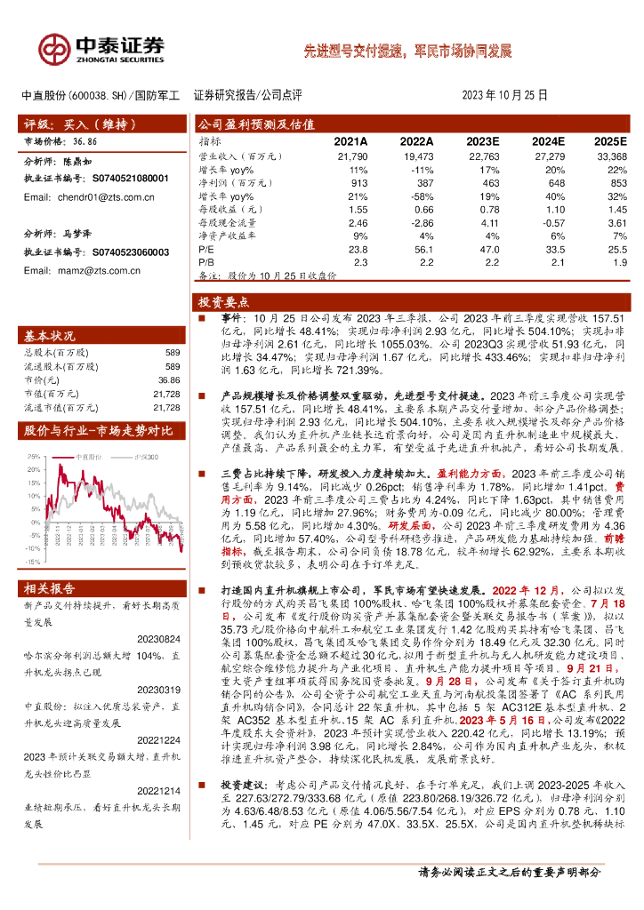 中泰证券:中直股份(600038)-先进型号交付提速,军民市场协同发展.pdf