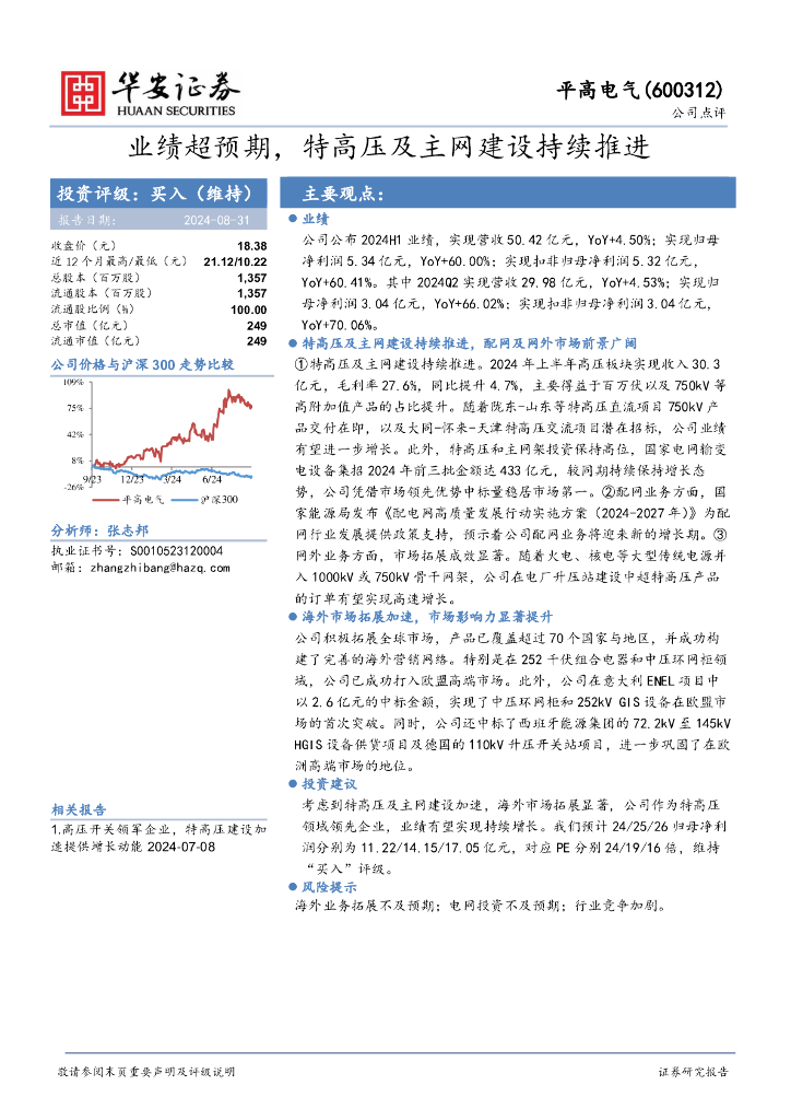 华安证券:平高电气(600312)-业绩超预期,特高压及主网建设持续推进.pdf