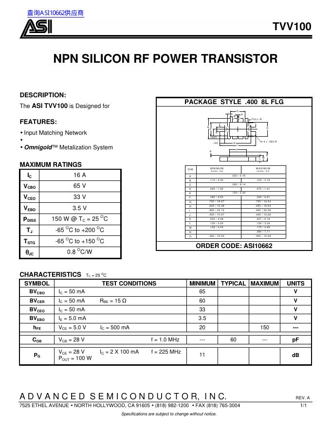 NPN SILICON RF POWER TRANSISTOR TVV100 数据手册.pdf