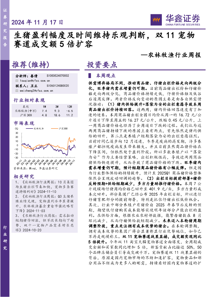 华鑫证券:农林牧渔行业周报:生猪盈利幅度及时间维持乐观判断,双11宠物赛道成交额5倍扩容.pdf