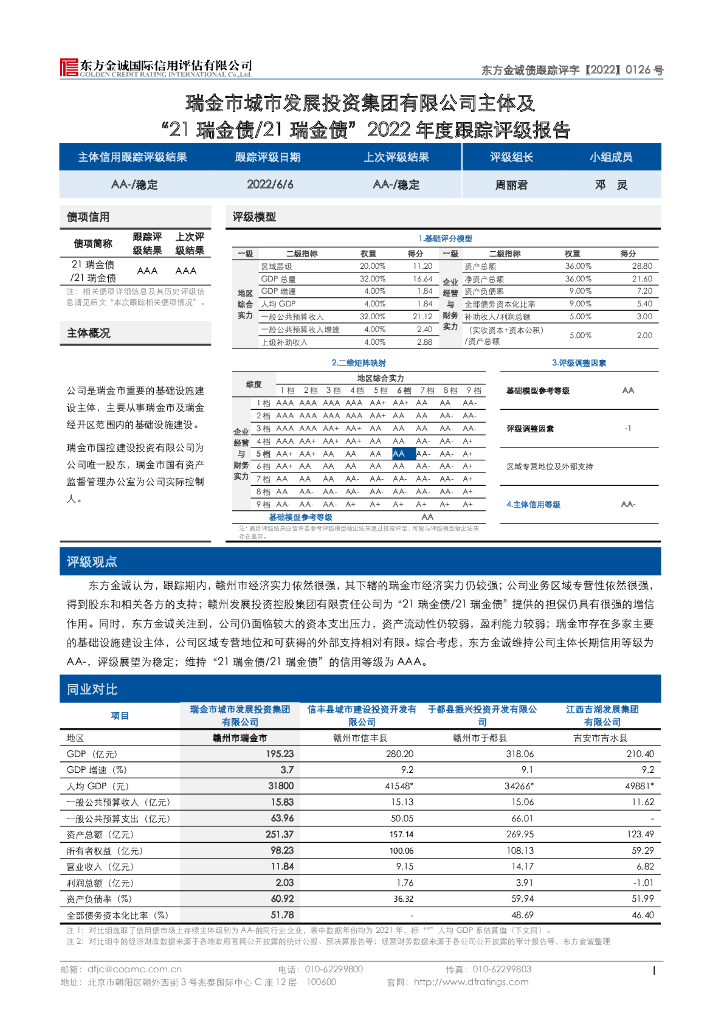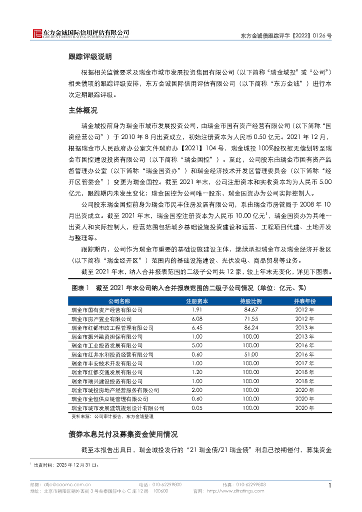 东方金诚:瑞金市城市发展投资集团有限公司主体及“21瑞金债21瑞金债”2022年度跟踪评级报告.pdf
