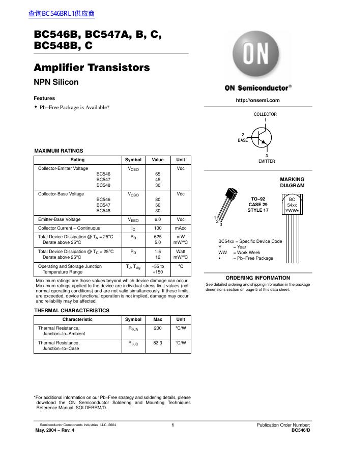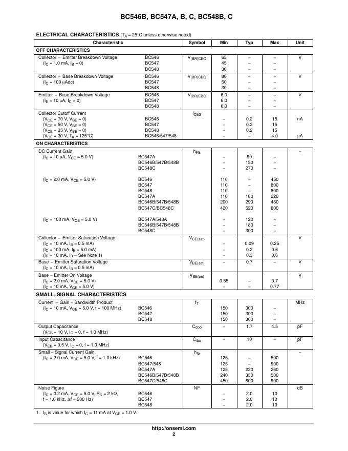 ON Semiconductor BC546B, BC547A, B, C, BC548B, C 数据手册.pdf