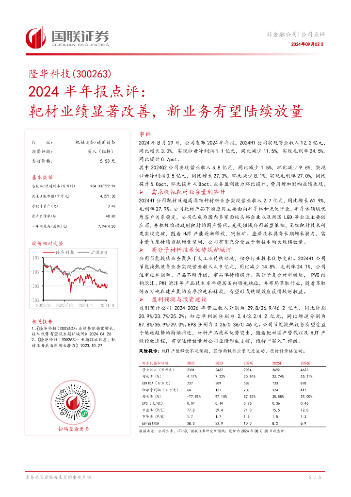 国联证券:隆华科技(300263)-2024半年报点评:靶材业绩显著改善,新业务有望陆续放量.pdf