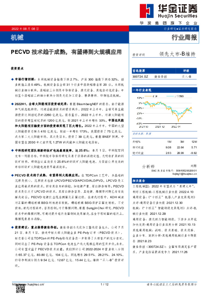 华金证券:机械行业周报:PECVD技术趋于成熟,有望得到大规模应用.pdf