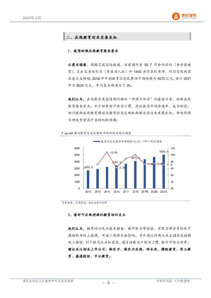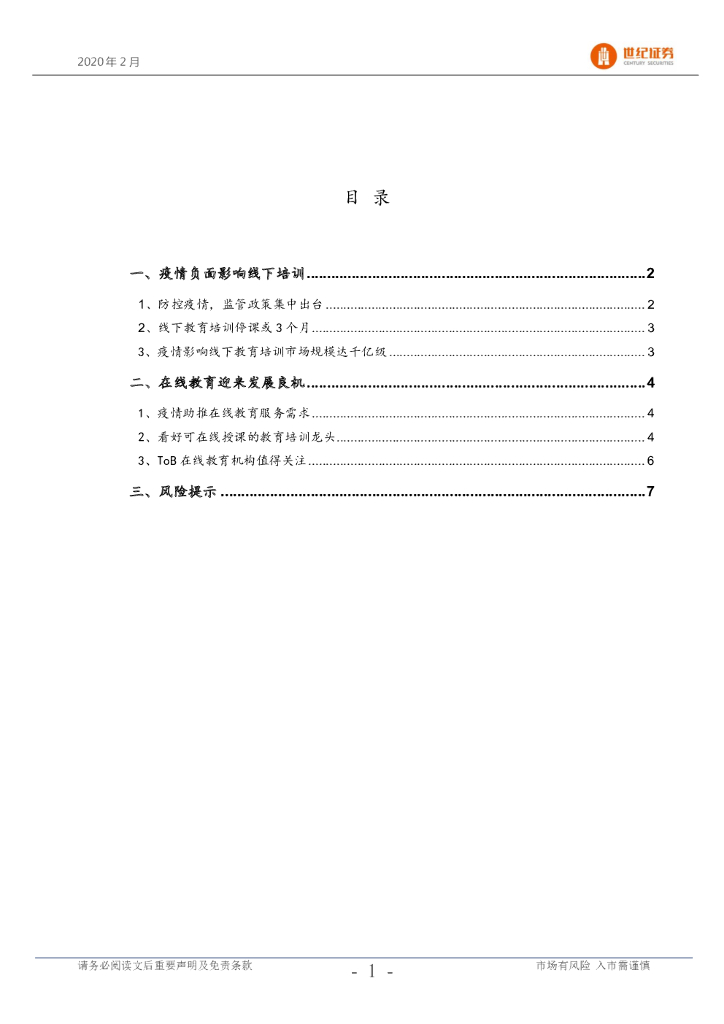 世纪证券:教育行业跟踪研究:疫情负面影响线下培训,看好在线教育.pdf