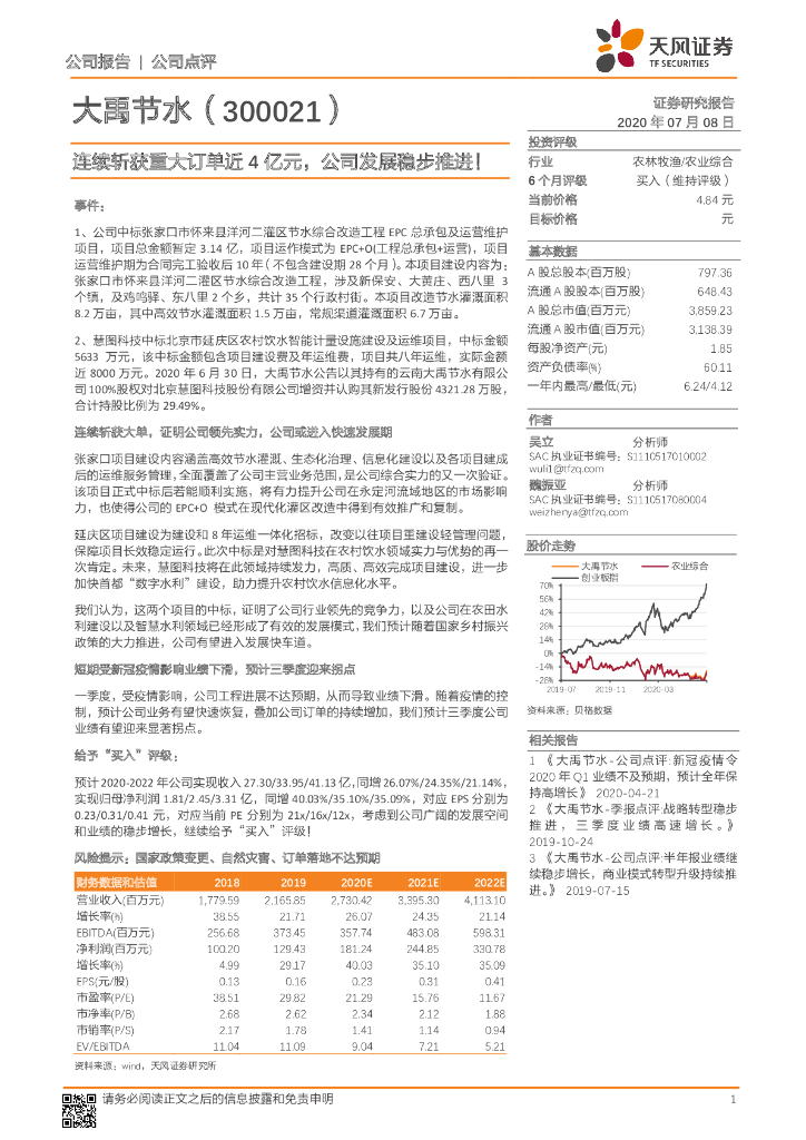 天风证券:大禹节水(300021)-连续斩获重大订单近4亿元,公司发展稳步推进!.pdf