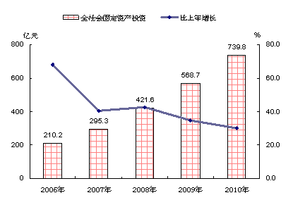 全年完成固定资产投资739.8亿元,比上年增长30.1%。其中,城镇以上固定资产投资623.9亿元,增长41.9%;农村固定资产投资115.9亿元,下降10.2%。