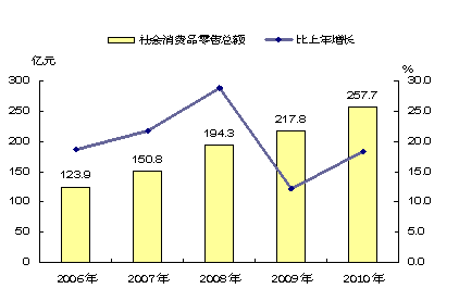全年实现社会消费品零售总额257.7亿元,比上年增长18.6%。其中城镇零售额238.0亿元,增长18.7%;乡村零售额19.7亿元,增长17.4%。按行业分,零售业实现零售额220.3亿元,增长19.1%,占零售总额的85.5%;餐饮业实现零售额29.1亿元,增长14.9%,占零售总额的11.3%。全年限额以上零售额71.9亿元,增长30.0%,占零售总额的比重达到27.9%,比上年提高2.4个百分点。