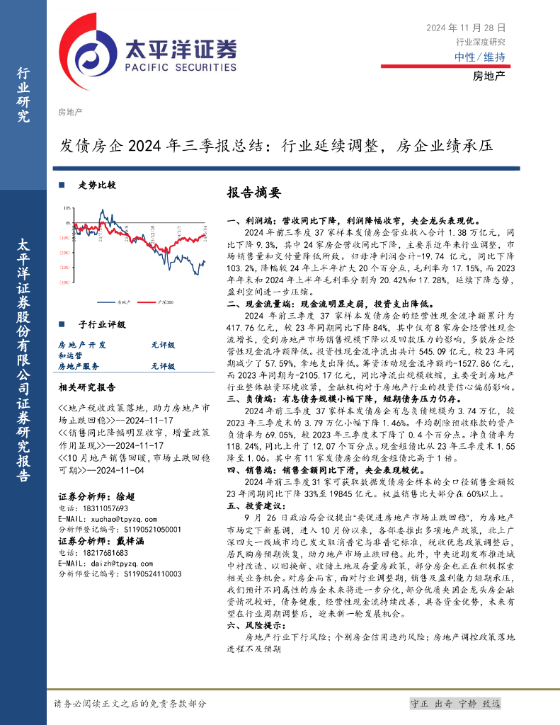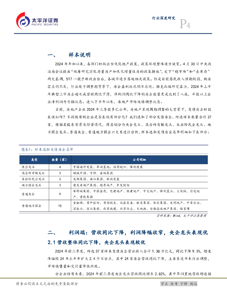 太平洋证券:发债房企2024年三季报总结:行业延续调整,房企业绩承压.pdf