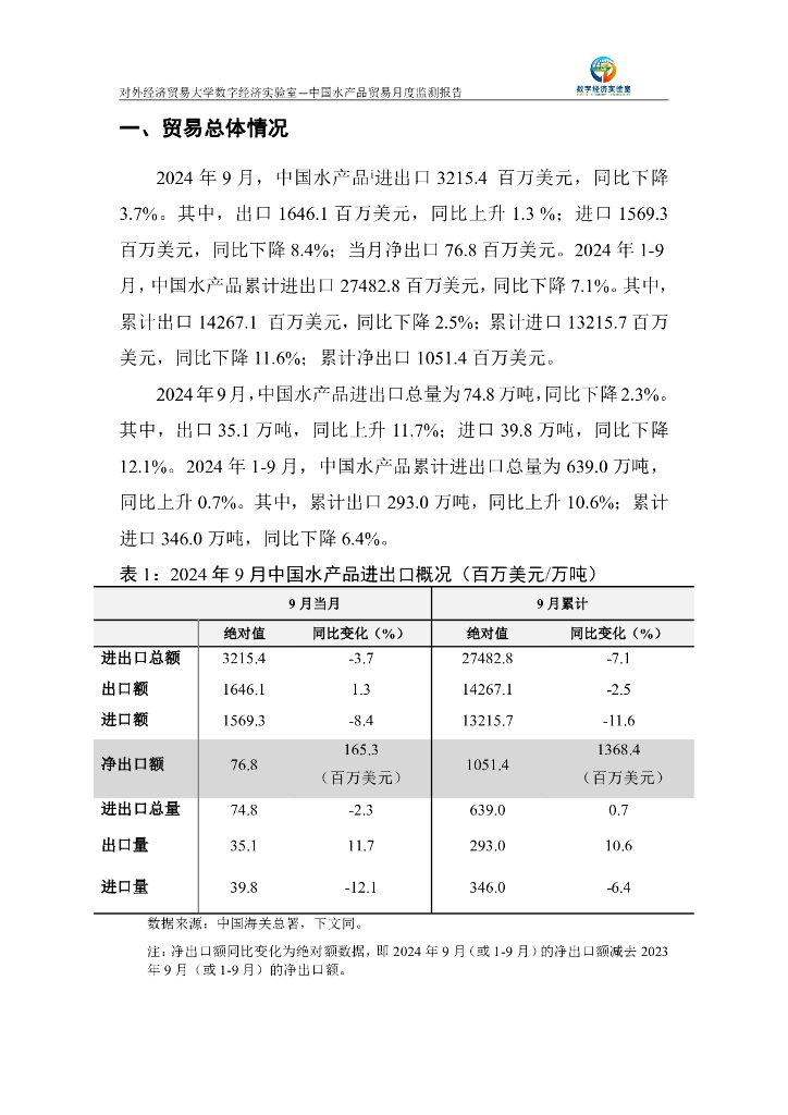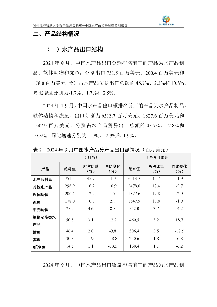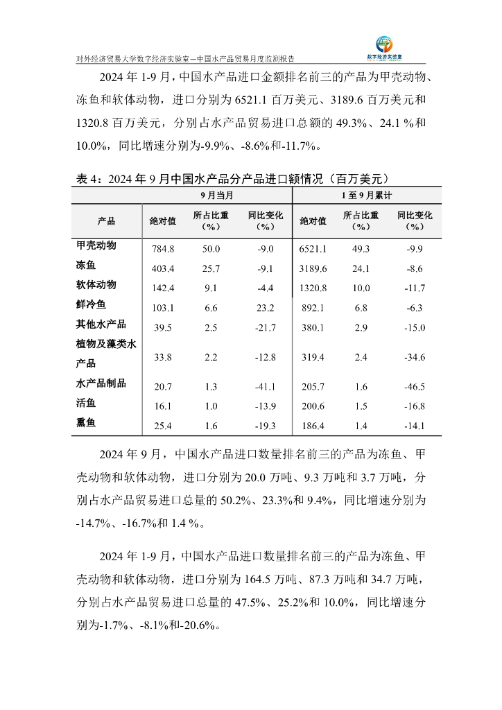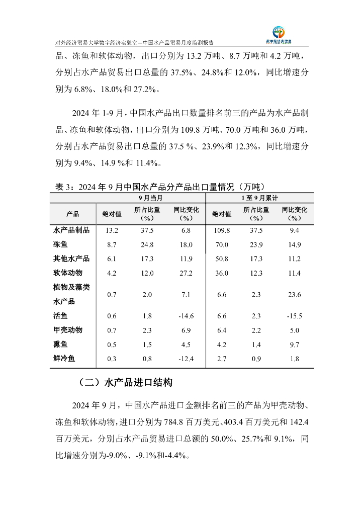 对外经济贸易大学:中国水产品贸易月度监测报告(2024年1-9月).pdf