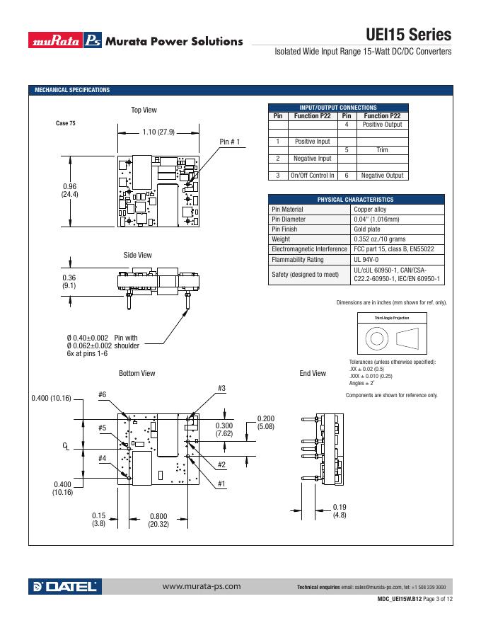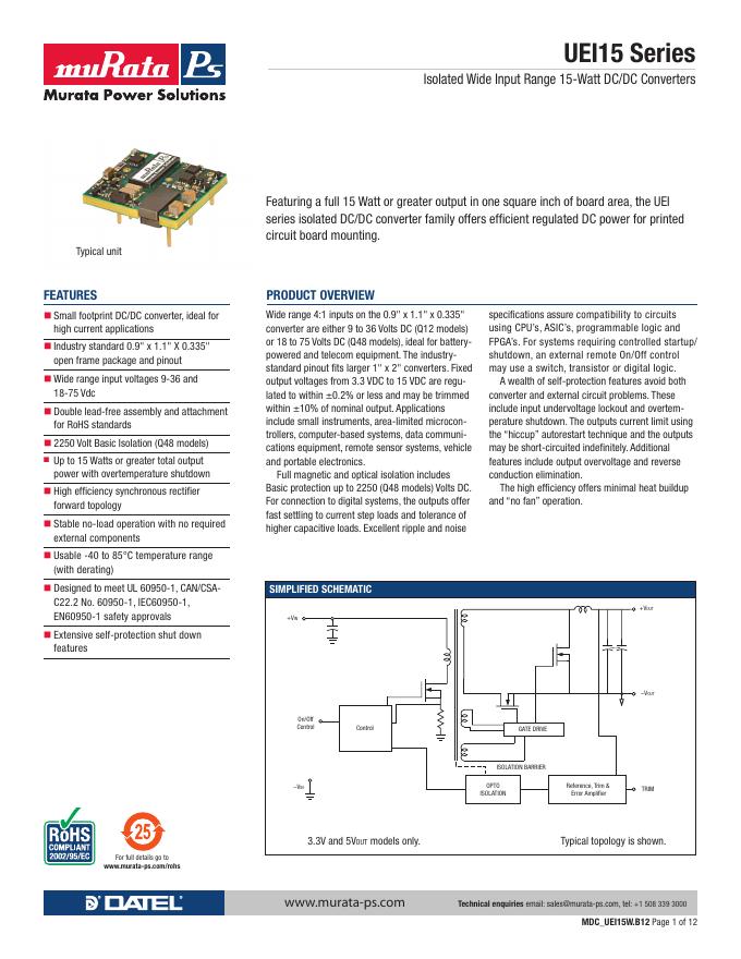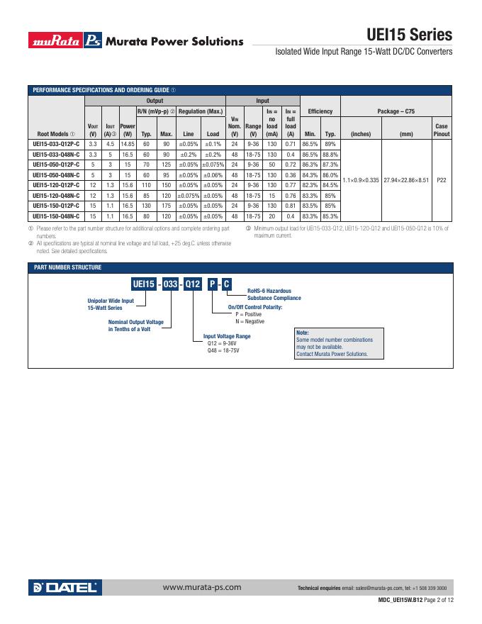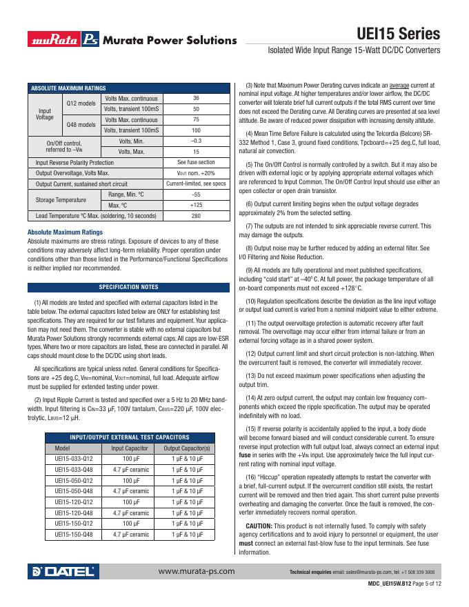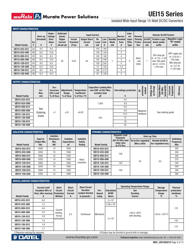 MURATA POWER SOLUTIONS UEI15 Series Isolated Wide Input Range 15-Watt DC/DC Converters 使用手册.pdf