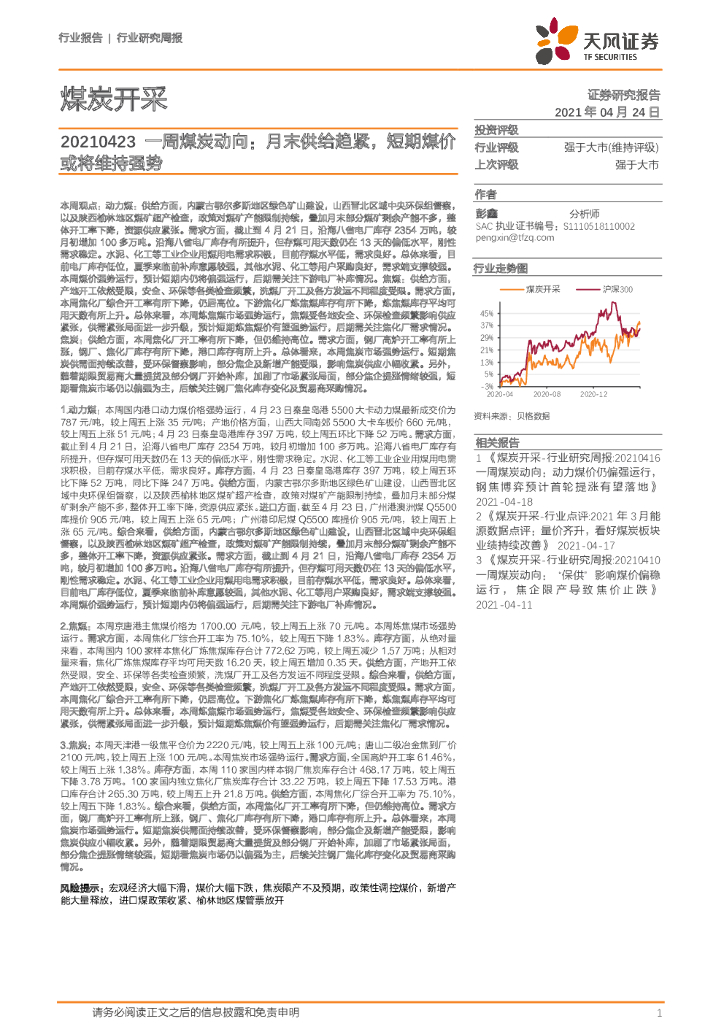 天风证券:煤炭开采行业一周煤炭动向:月末供给趋紧,短期煤价或将维持强势.pdf